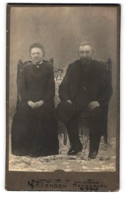 Fotografie H. Jensen, Rendsburg, Wallstr. 1, Älteres Paar in schwarzer Kleidung
