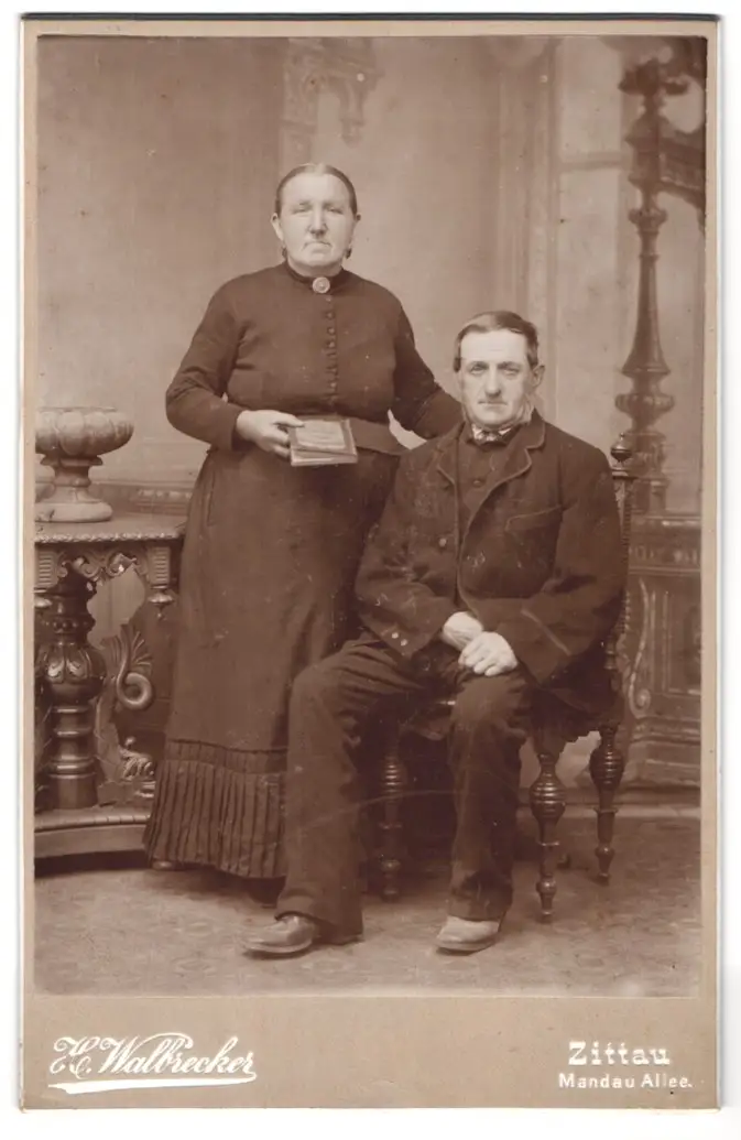 Fotografie H. Walbrecker, Zittau, Mandau Allee, Portrait älteres Paar in schwarzer Kleidung mit Buch