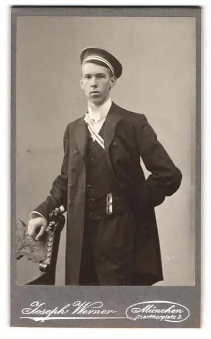 Fotografie Joseph Werner, München, Student im Anzug mit Couleuer und Bierzipfel