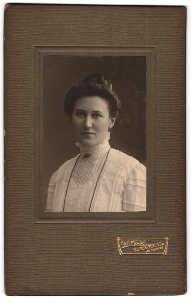 Fotografie Karl Mäckel, Burgstädt i /Sa., Junge Dame mit Hochsteckfrisur und Kragenbrosche
