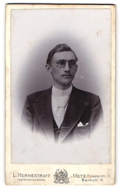 Fotografie L. Hermstroff, Metz, Junger Mann mit Krawatte, Einstecktuch und einem Zwicker