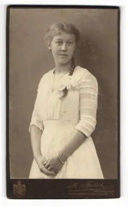 Fotografie M. Frölich, Flensburg, junges Mädchen im weissen Kleid mit geflochtenem Zopf