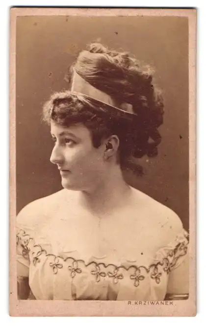 Diese CDV Fotografie zeigt eine Frau im Profil, deren anmutiges Gesicht von einer kunstvoll frisierten Hochsteckfrisur umrahmt wird. Ihr Haar ist mit einem breiten Band verziert, das die Frisur elegant betont. Das Kleid, das sie trägt, ist reich mit feinen Stickereien geschmückt und verleiht dem gesamten Porträt einen Hauch von klassischer Eleganz. Die sanfte Beleuchtung und der neutrale Hintergrund lenken die volle Aufmerksamkeit auf die eindrucksvolle Erscheinung der Dame., guter Zustand