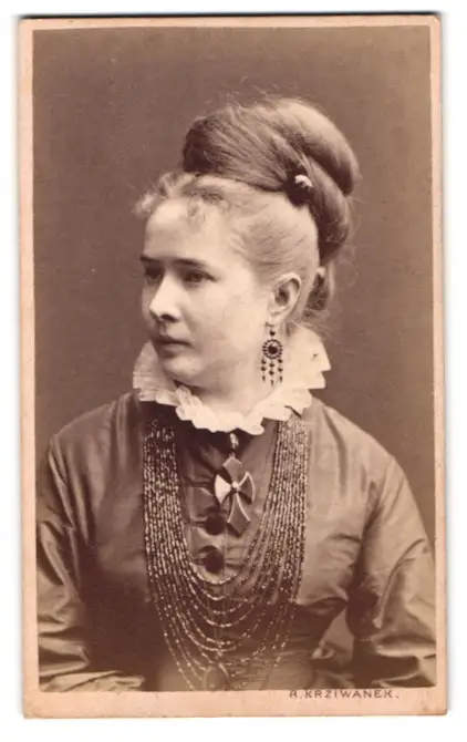 Fotografie R. Krziwanek, Wien, Portrait junge Gräfin Minette Odescalchi im Kleid mit Ohrringen