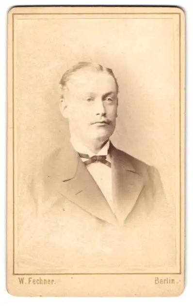 Fotografie W. Fechner, Berlin, Krausen-Str. 21, Junger Mann im Anzug mit feiner Fliege und Schnurrbart