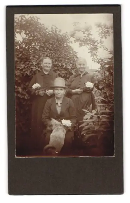 Fotografie unbekannter Fotograf und Ort, Drei ältere Damen in hübscher Kleidung