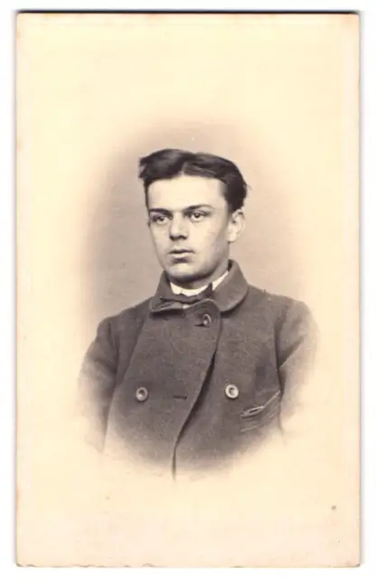 Fotografie unbekannter Fotograf und Ort, Junger Herr im Mantel mit Fliege