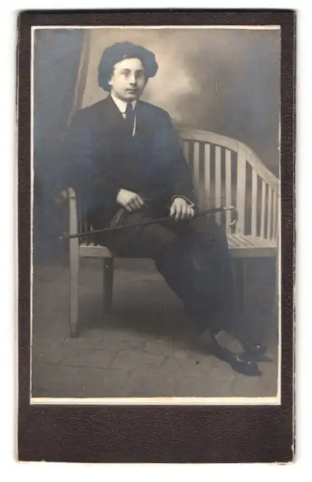 Fotografie unbekannter Fotograf und Ort, Portrait junger Student im Anzug mit Flanierstock