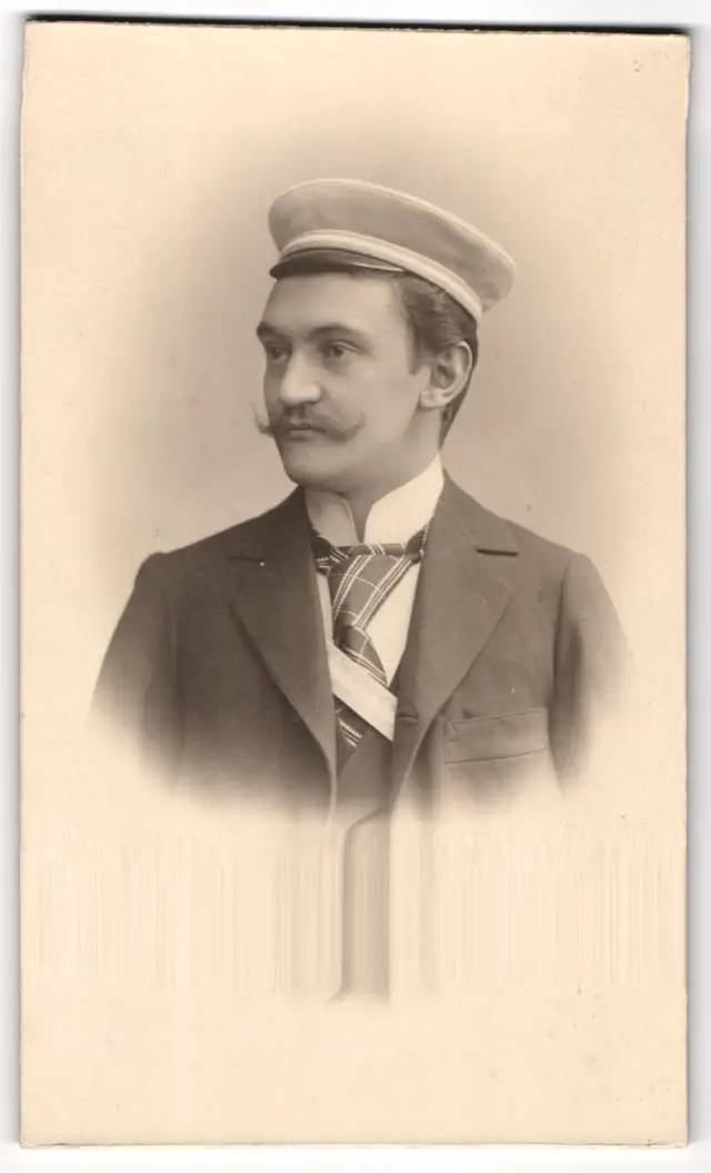 Fotografie unbekannter Fotograf und Ort, Student mit Moustache im edlen Anzug, Tellermütze mit Couleur