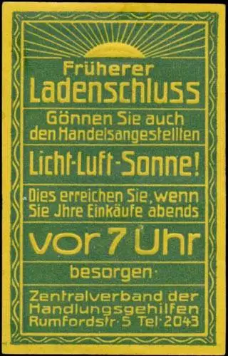 Gönnen Sie auch den Handelsangestellten Licht-Luft-Sonne! Dies erreichen Sie, wenn Sie Ihre Einkäufe abends vor 7 Uhr besorgen. Rumfordstraße 5, Handel, Größe/Zustand: 6x4 , guter Zustand, Original alte Reklamemarke die seinerzeit für die Werbung benutzt wurde