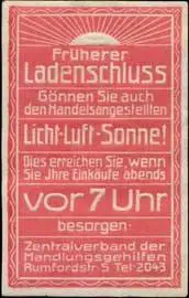 Gönnen Sie auch den Handelsangestellten Licht-Luft-Sonne! Dies erreichen Sie, wenn Sie Ihre Einkäufe abends vor 7 Uhr besorgen. Rumfordstraße 5, Handel, Größe/Zustand: 6x4 , guter Zustand, Original alte Reklamemarke die seinerzeit für die Werbung benutzt wurde