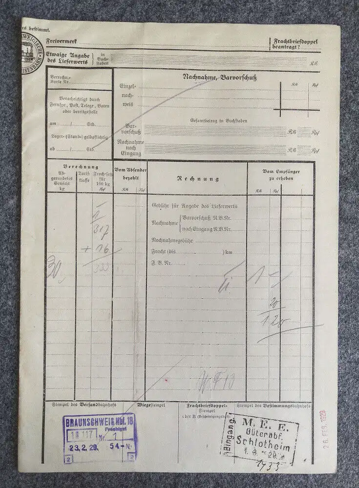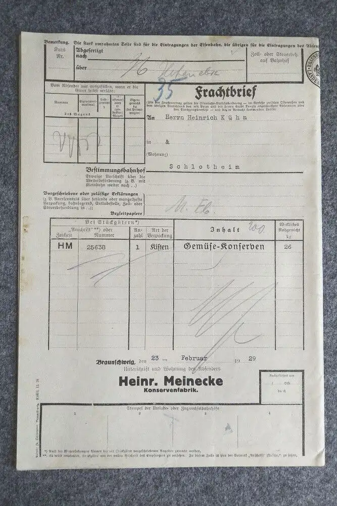 Originaler, zweiseitiger Frachtbrief, 1929. Format ca. A4. Erhaltung: leicht unsauber, alles weitere siehe bitte Scans. Diese Ware unterliegt der Differenzbesteuerung nach § 25a UStG. Es wird keine Mehrwertsteuer in der Rechnung ausgewiesen.