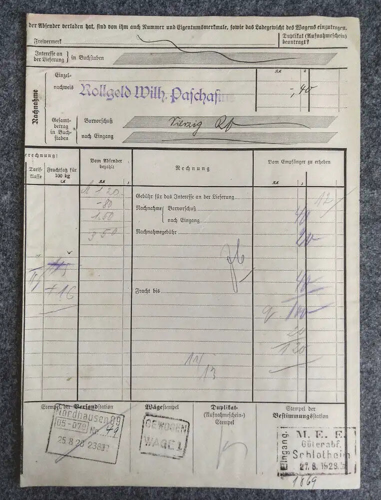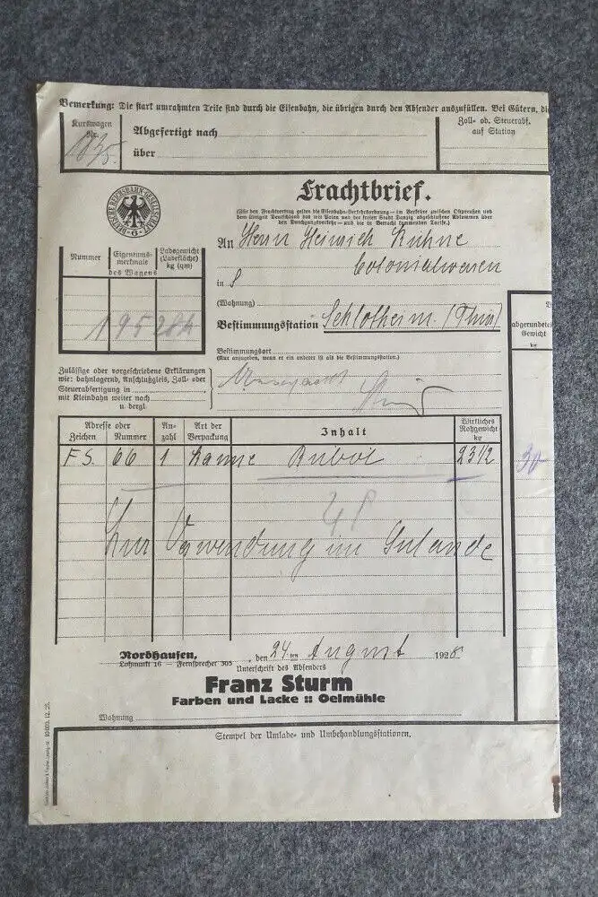 Originaler, zweiseitiger Frachtbrief, 1928. Format ca. A4. Erhaltung: leicht unsauber, alles weitere siehe bitte Scans. Diese Ware unterliegt der Differenzbesteuerung nach § 25a UStG. Es wird keine Mehrwertsteuer in der Rechnung ausgewiesen.