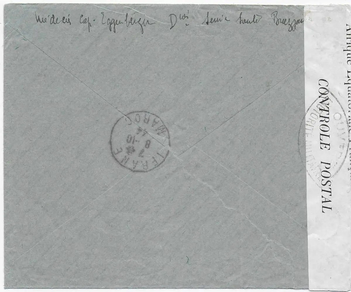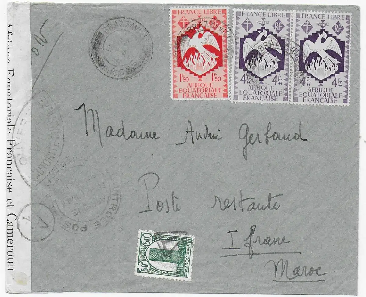 France Libre: Brazzaville Afrique equatoriale francais 1944 to Marocco, censor
