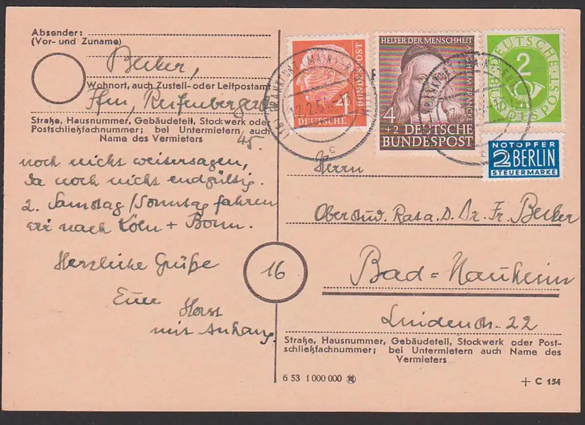 Francke August Hermann evang. Theologe MiNr. 173 in MiF, Heuss 2 Pf. Ziffer Karte 17.2.54
