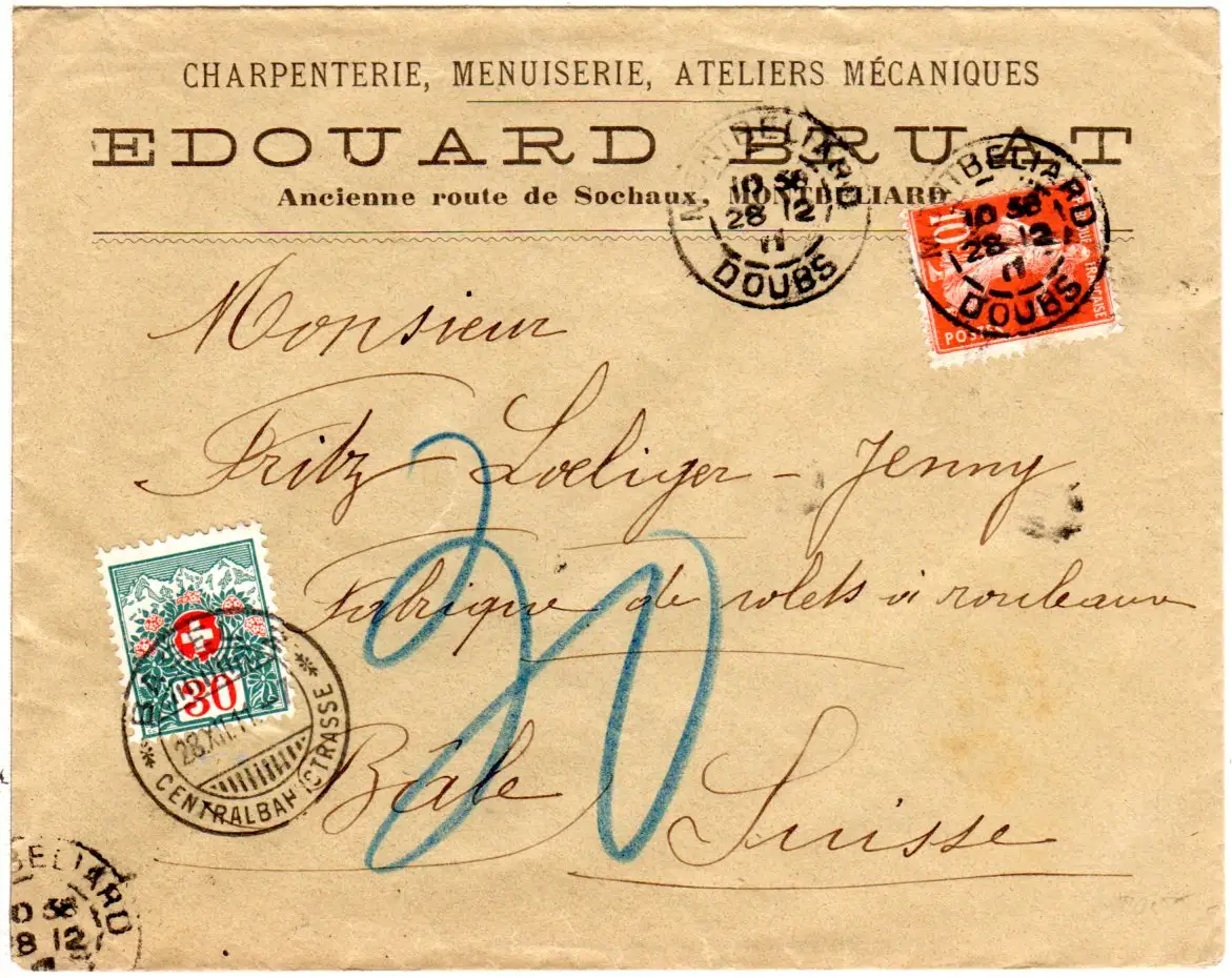 Ungenügend frankierter Firmenbrief E. Bruat nach Basel mit Schweiz Portomarke