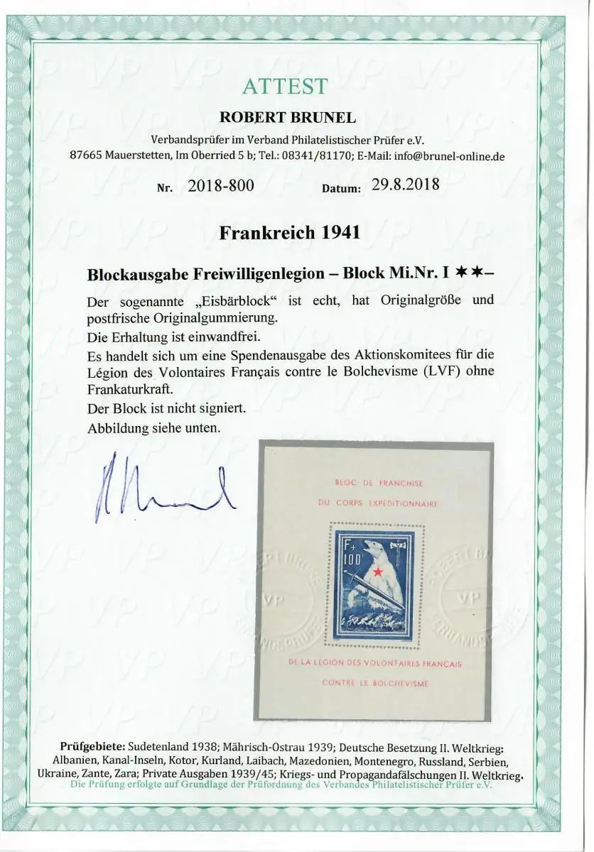 Frankreich 1941: MiNr. Block I, postfrisch, **