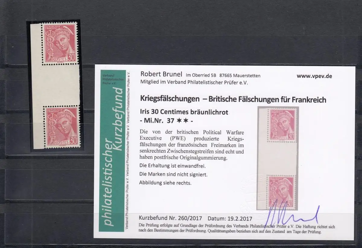 Frankreich- Britische Propagandafälschung MiNr. 37, postfrisch, Randstück, ZW