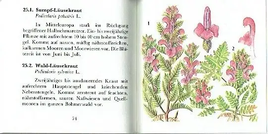 sehr guter Zustand, geringe Gebrauchs- und Alterungsspuren: Einband leicht beschabt und mit wenigen kleinen Blessuren, Miniaturbuch über Pflanzen des Böhmerwaldes Vorwort - Die unbelebte Natur und die Vegetation des Böhmerwaldes - Naturschutz im B. - etwas mehr als 50 Pflanzen werden in Bild und Kurzbeschreibung vorgestellt, Kunstleder, ca. 7,5 x 7,5, 137 Seiten, davon 50 Bildtafeln