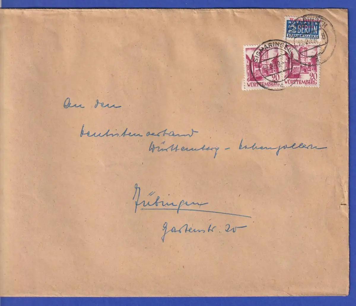 Franz. Zone Württemberg großf. Brief mit MEF 20Pfg Mi.-Nr.34 O SIGMARINGEN