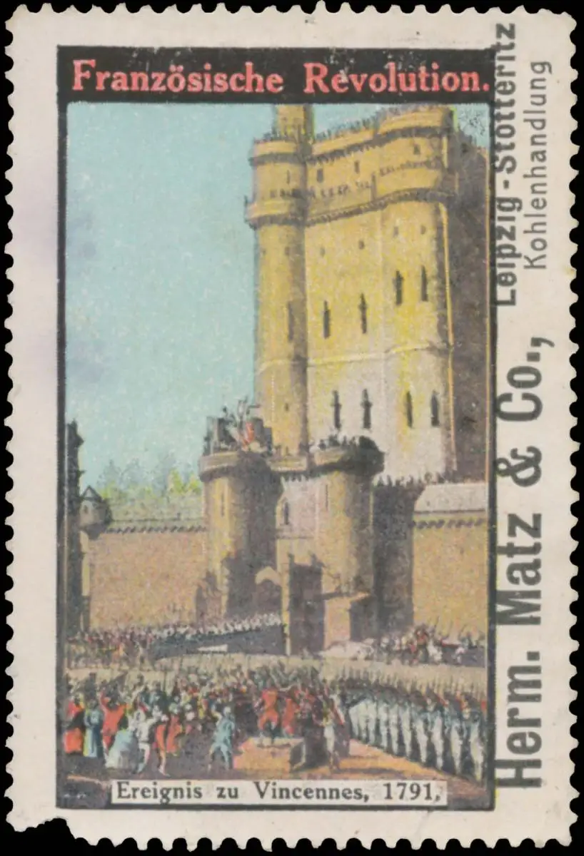 Ereignis zu Vincennes, 1791, Größe/Zustand: 6x4 , beschädigt, Original alte Reklamemarke die seinerzeit für die Werbung benutzt wurde