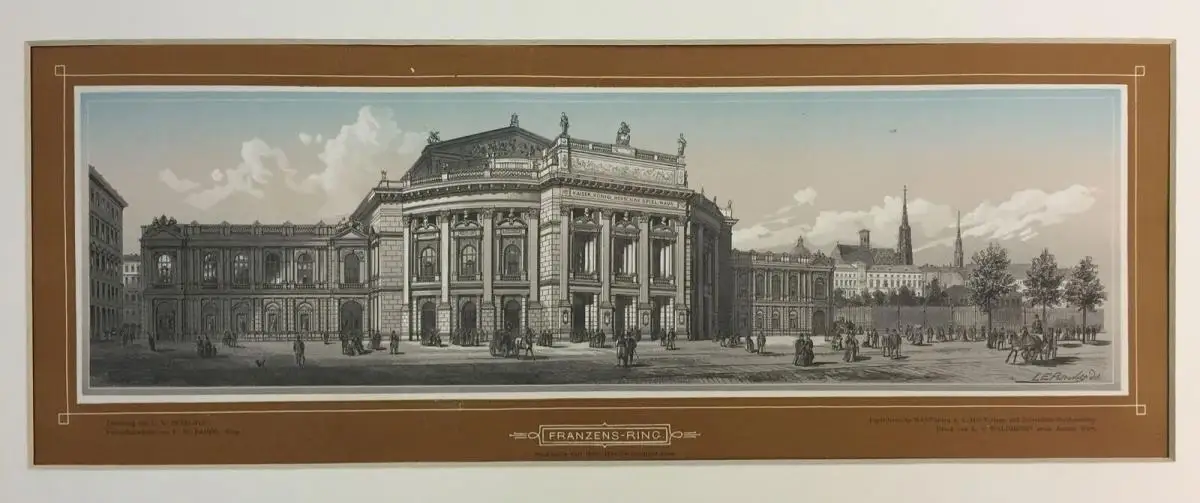 Wien, Manz`sche Buchhandlung (1875). Orig.-Farbenholzschnitt v. F. W. Bader nach L. E. Petrovits aus "Die Wiener Ringstrase in ihrer Vollendung und der Fraz Josefs Quai". Blattgröße 23 x 63 cm., Bildausschn. 13 x 44 cm. Unter Passepartout.