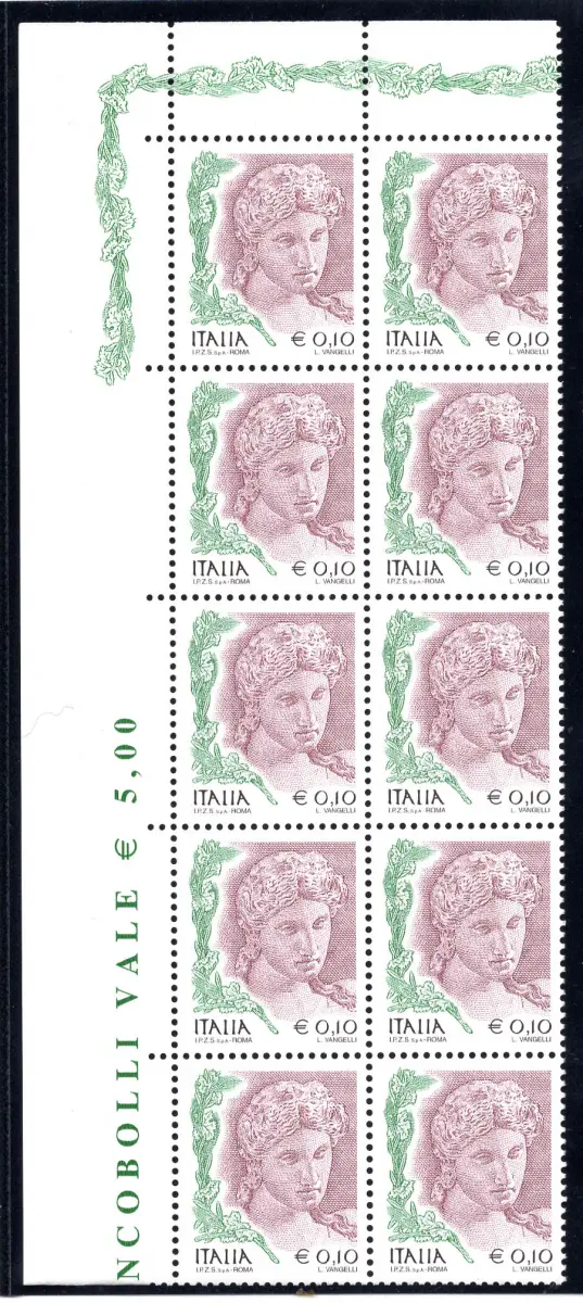 Frau in der Kunst Euro 0,10 mit Fehler auf den Randangaben ** postfrisch - Frau in der Kunst Euro 0,10 Nr. 2724A Block von zwanzig Exemplaren a. di f. (2x10) mit Fehler auf den Randangaben: Der Hundertfachbogen ist 5,00 Euro wert - Kuriosität zur Spezialisierung auf die Sammlung Nr. 781/20