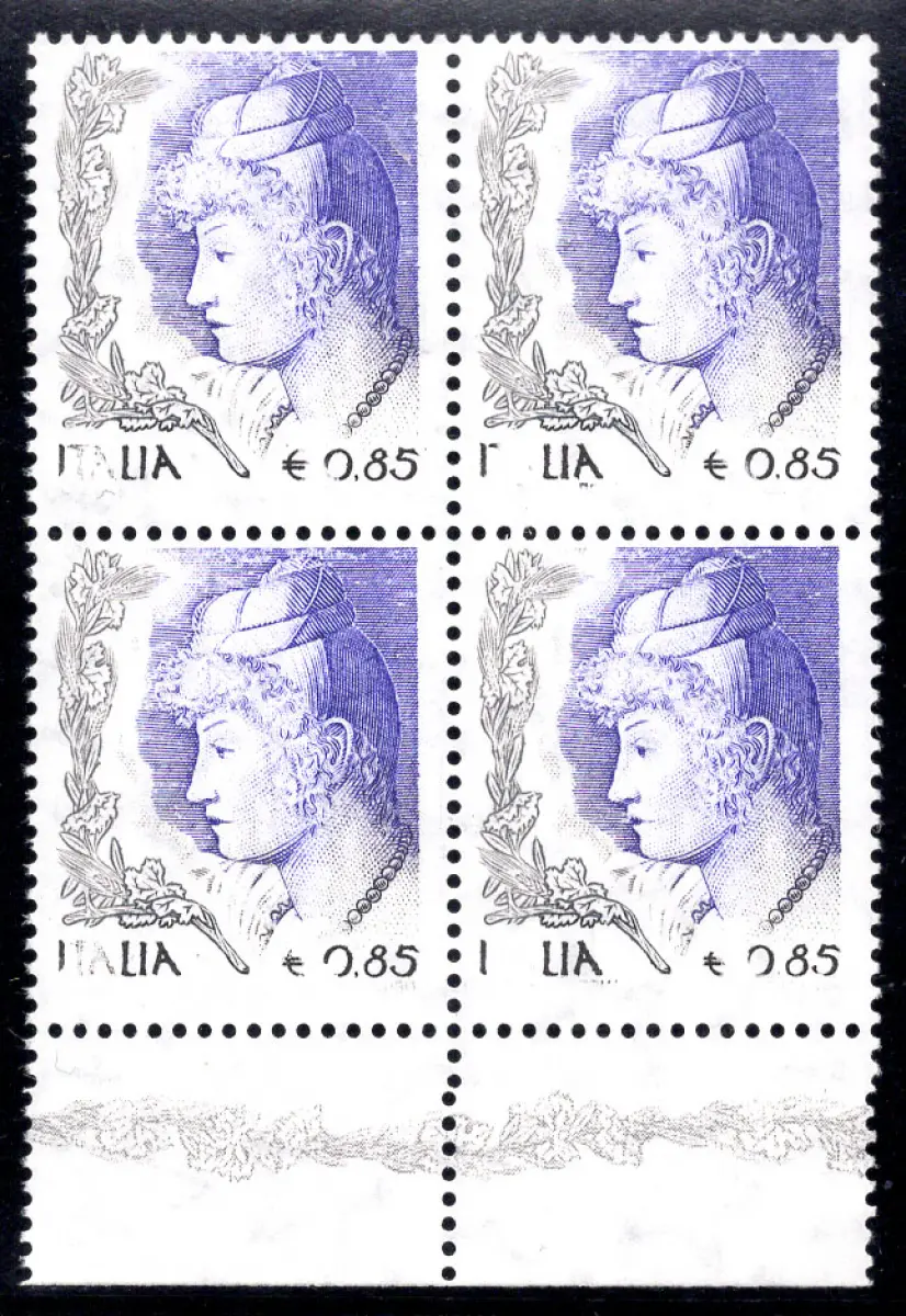 MNH - Vollgummi - Frau in der Kunst Euro 0,85 Nr. 2729 Viertel mit verschobener horizontaler Verzahnung und Druck von Schwarz Italien Euro 0,85 verblassend - Ungewöhnlich für Sammler, die sich auf die Ausgabe spezialisiert haben Cod. 944/17