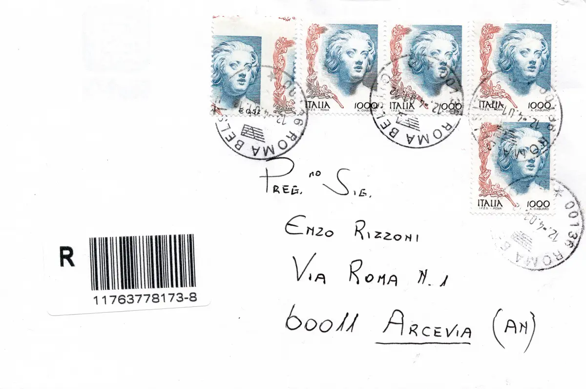 Umschlag - Frau in der Kunst Lire 1.000 / Euro0,52 Nr. 2397 mit stark in beide Richtungen verschobener Verzahnung auf Racc. mit Zwillingszusatzwerten ab 1.000 Lire - Seltene Verwendung der Sorte aus der oberen Reihe des Blattes ohne Schriftzug Italien 1.000 mit Blumenornament rechts statt links Cod. 923/17