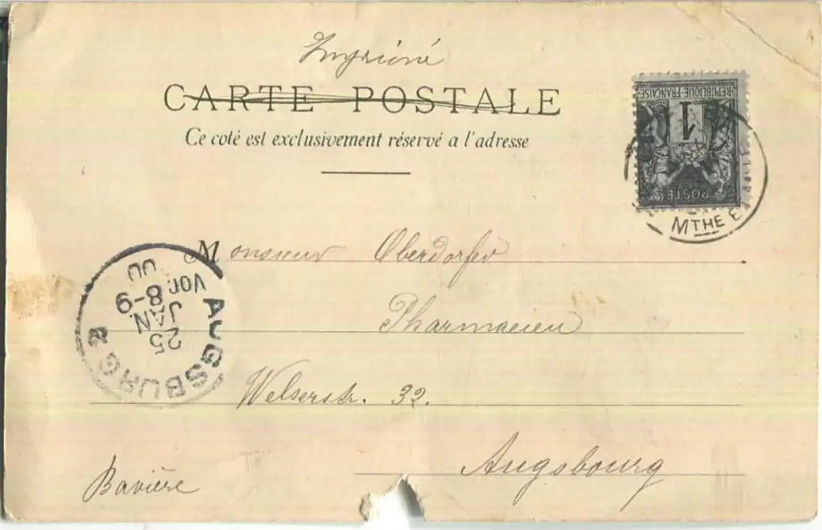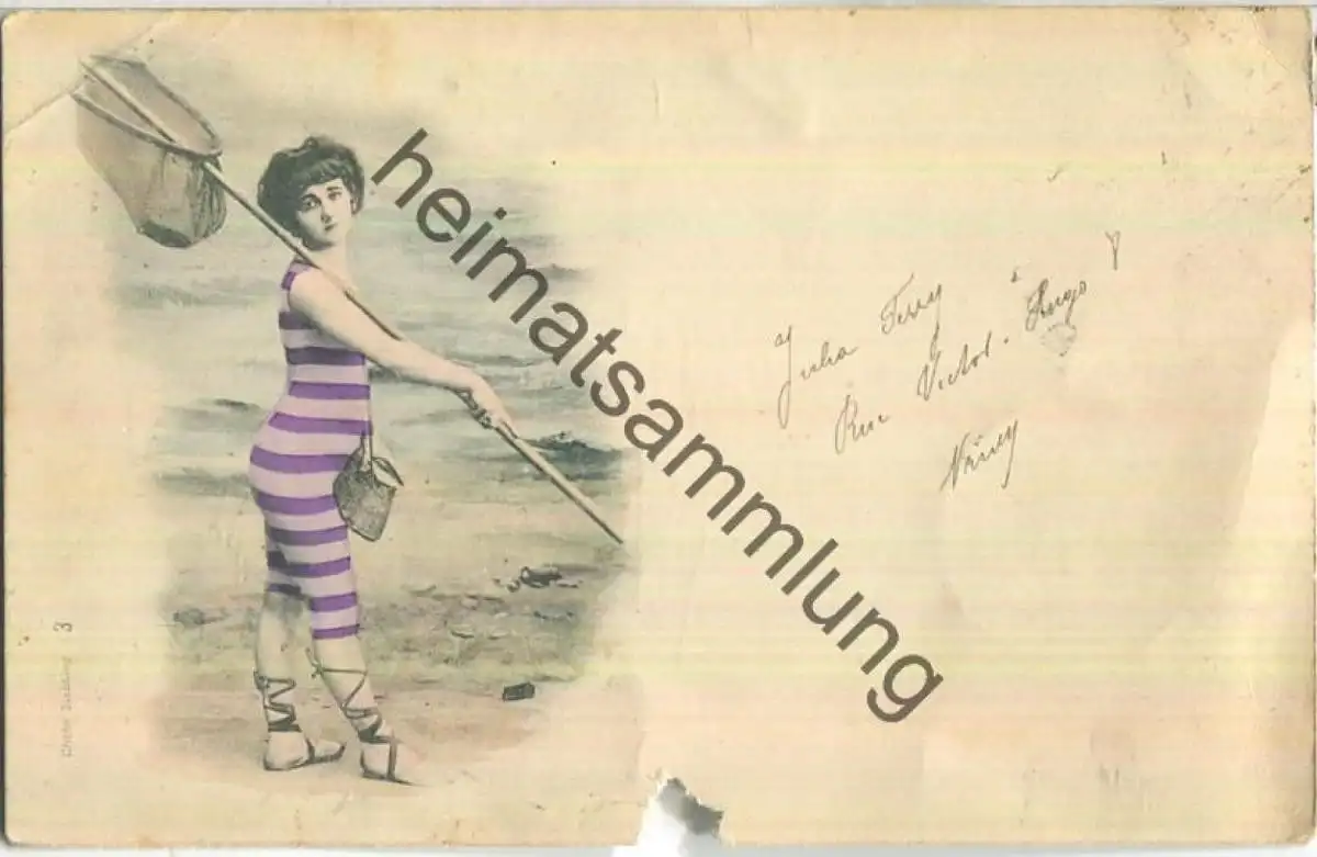 Frau mit Kescher - Cliche Siebling 3 - starke Gebrauchsspuren (E97965) gel. 1900