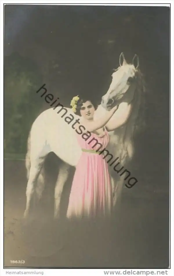Frau mit Pferd - Schimmel - coloriert (E15649) gel. 1914