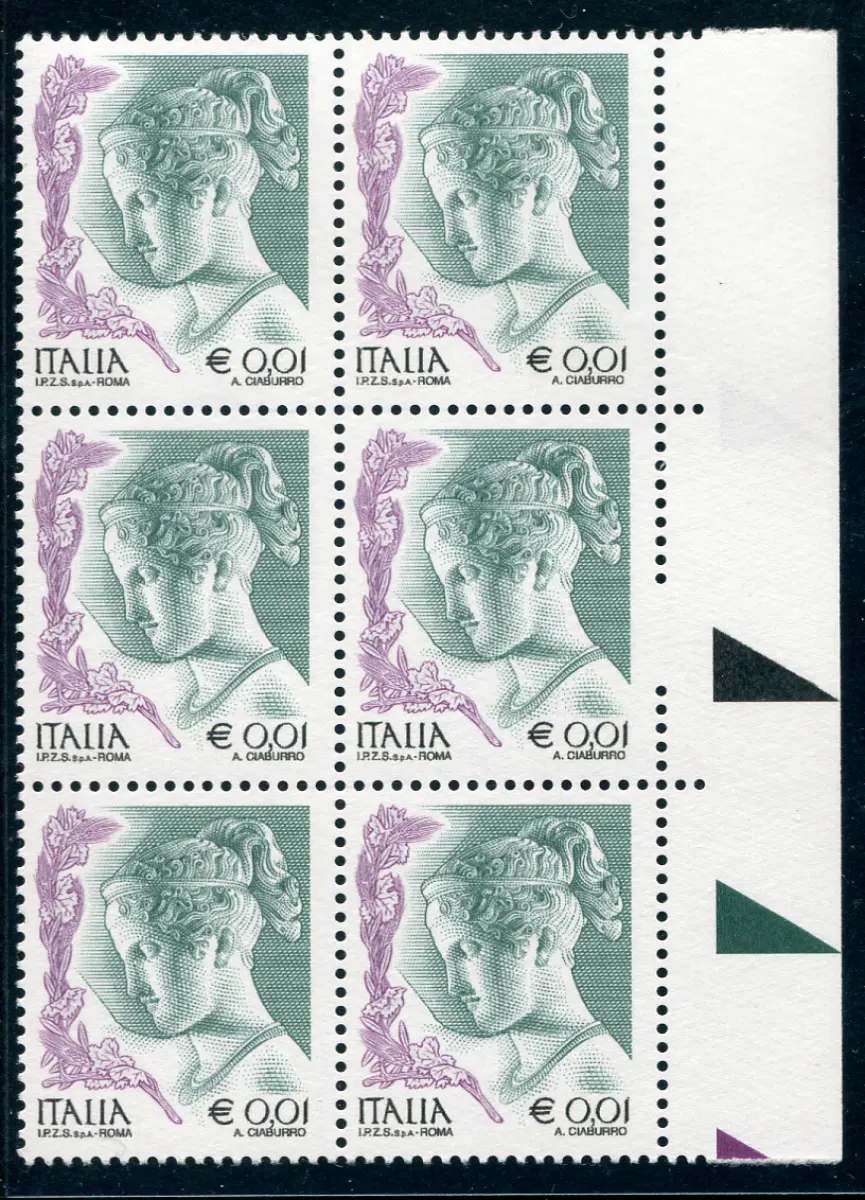 Frauen in der Kunst Euro 0,01 Sorte unvollständige Verzahnung Vollgummi MNH - Frauen in der Kunst Euro 0,01 Nr. 2721 Sechserblock b. von f. davon ein Exemplar mit unvollständiger rechtsvertikaler Verzahnung, wegen fehlerhafter Funktion des Bohrers - Ungewöhnlich Cod. 729/15