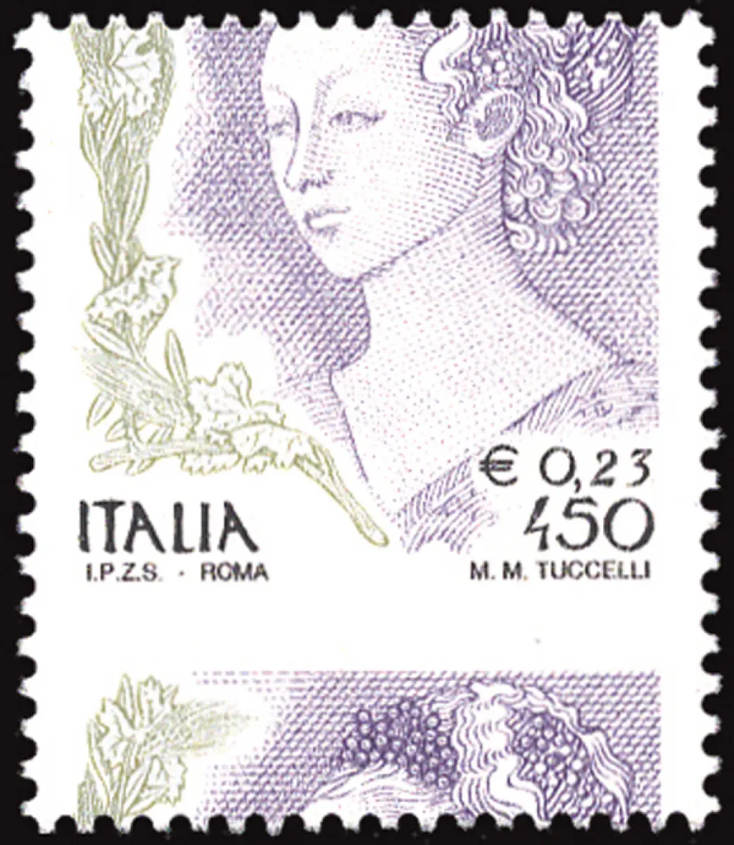 MNH - Vollgummi - - Frauen in der Kunst Lire 450 / Euro 0,23 Nr. 2394 stark verschobene horizontale Verzahnung (Kat. Einheitliche Nr. 2430Bb) - Ungewöhnlich - Kat. euro 200 Cod.783/182