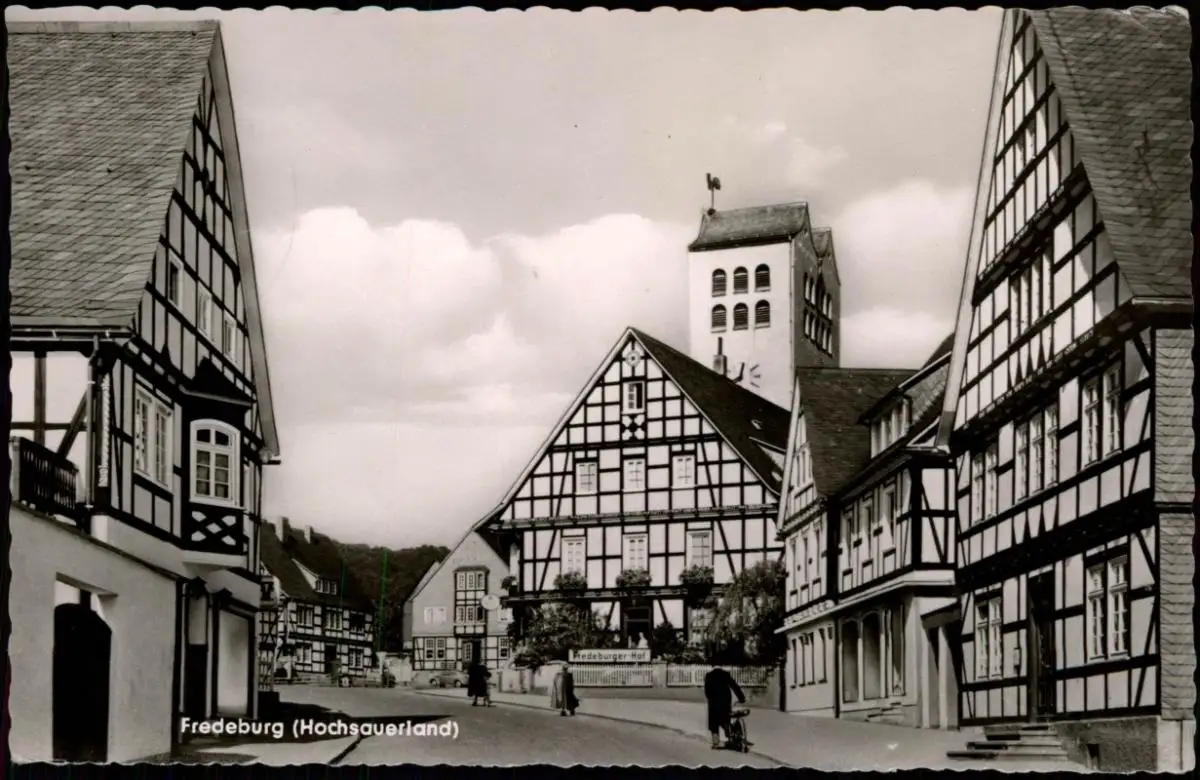 Fredeburg (Hochsauerland) Ortsansicht mit Straße und Fachwerk-Häusern 1962