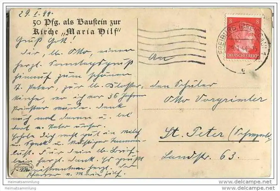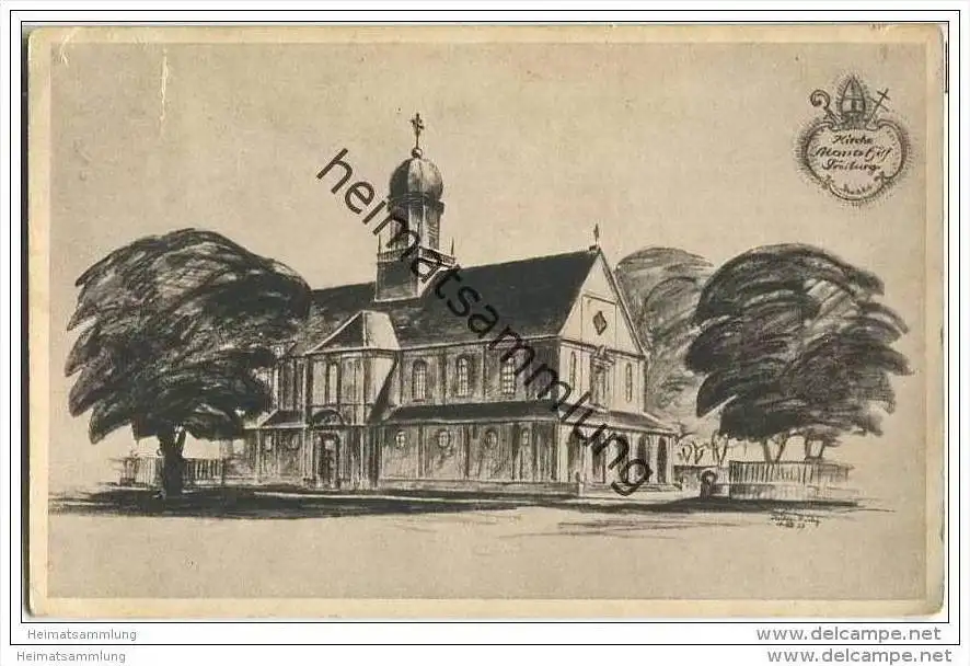 Freiburg - Kirche Maria Hilf - Bausteinkarte - Verlag F. Bruckmann AG München - leichte Gebrauchsspuren (G27872) gel. 1944