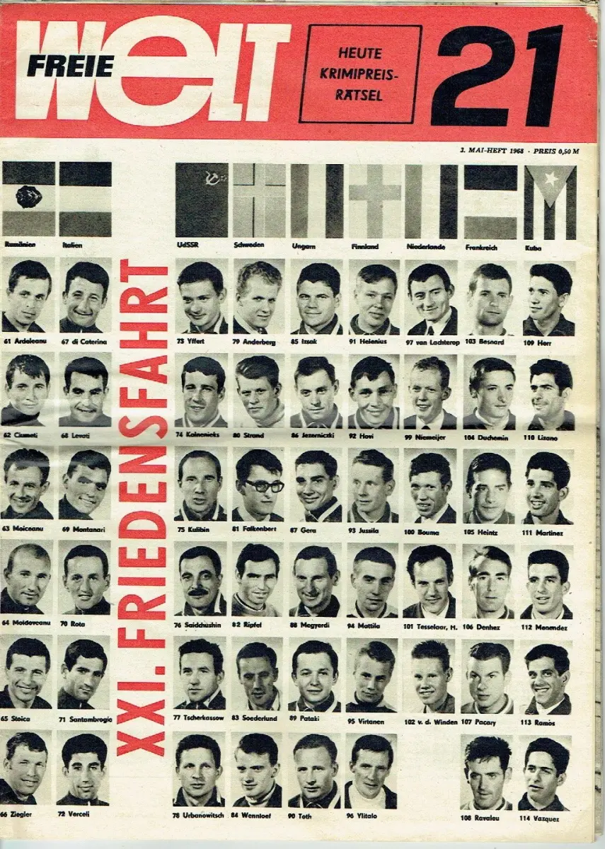 guter Zustand, geringe Gebrauchs- und Alterungsspuren: Papier teils etwas vergilbt, aber Seiten sauber und ordentlich - teils etwas eselsohrig - kleine Blessuren - mittig quer gefalten - rechte obere Ecken teils etwas abgefressen, Zeitung der DDR enthält u. a. Reklame, Romane, Kurzerzählungen, Rätsel, Karikaturen, Reportagen, Artikel über DDR-Politik, Sport und Leben, Technik und Wissenschaft, Reportagen aus der deutschen, sowjetischen und internationalen Geschichte und dem Fernsehprogramm der Woche etc. hier zusätzlich auf den beiden Umschlagseiten kleine Fotos aller Teilnehmer der Friedensfahrt, Softcover, ca. 26 x 36 cm, 40 Seiten mit zahlreichen Bildern