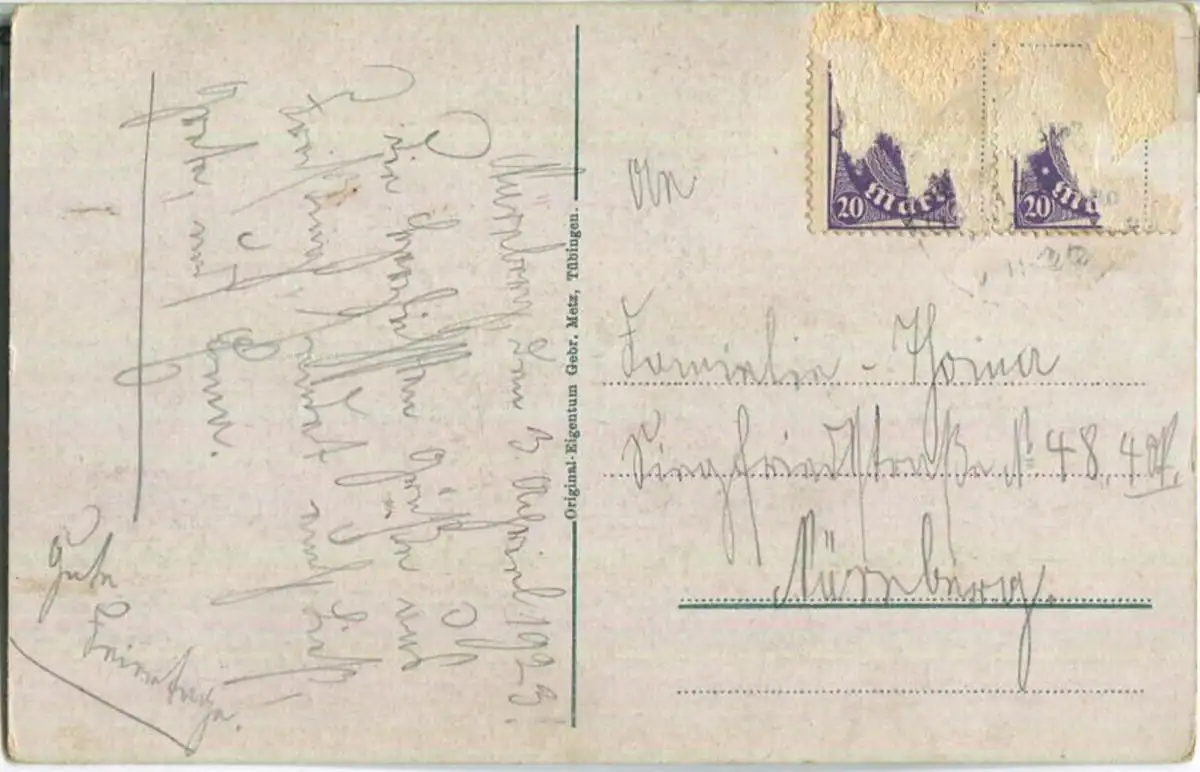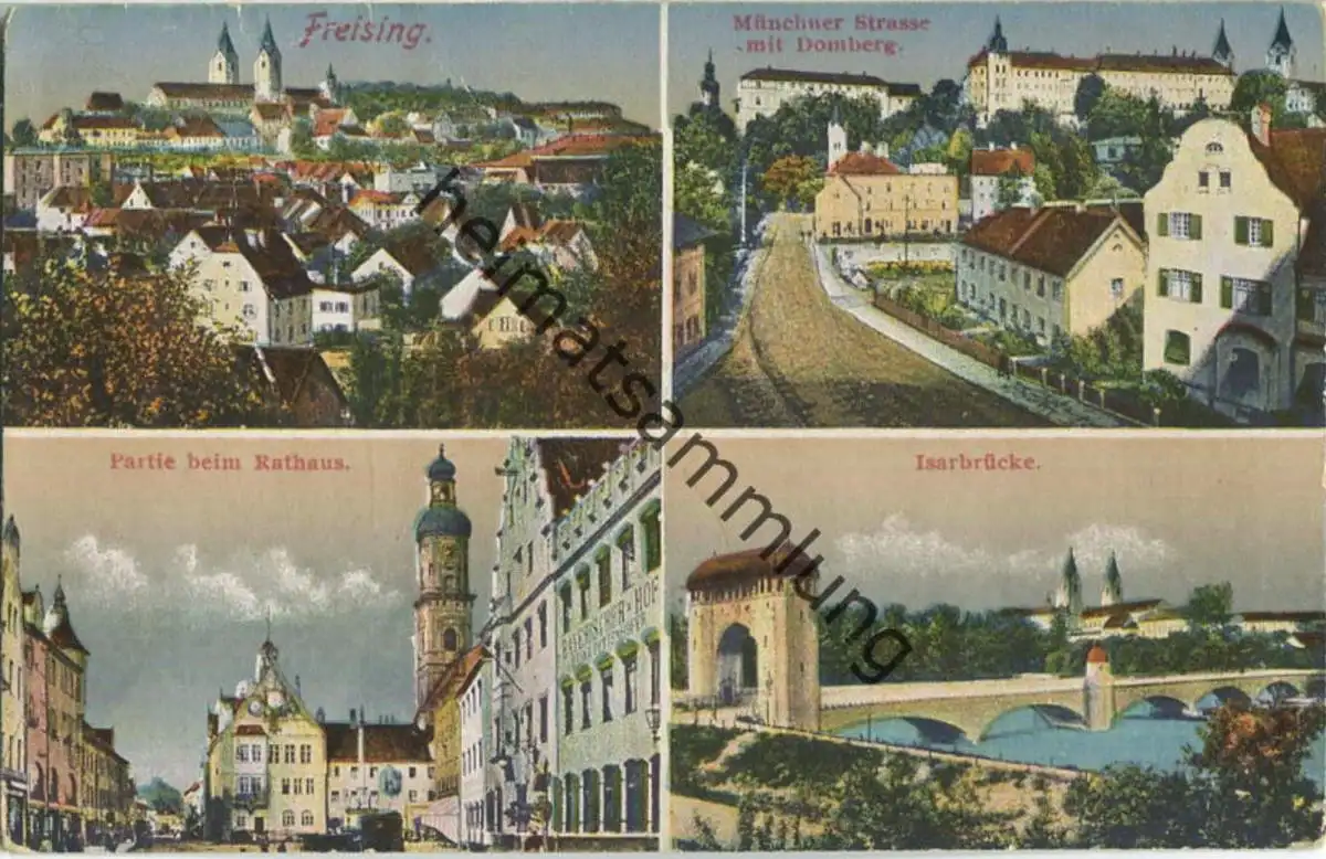 Freising - Münchner Strasse - Rathaus - Verlag Gebr. Metz Tübingen - Briefmarke abgerissen - leichte Gebrauchsspuren (G13241) gel. 1923