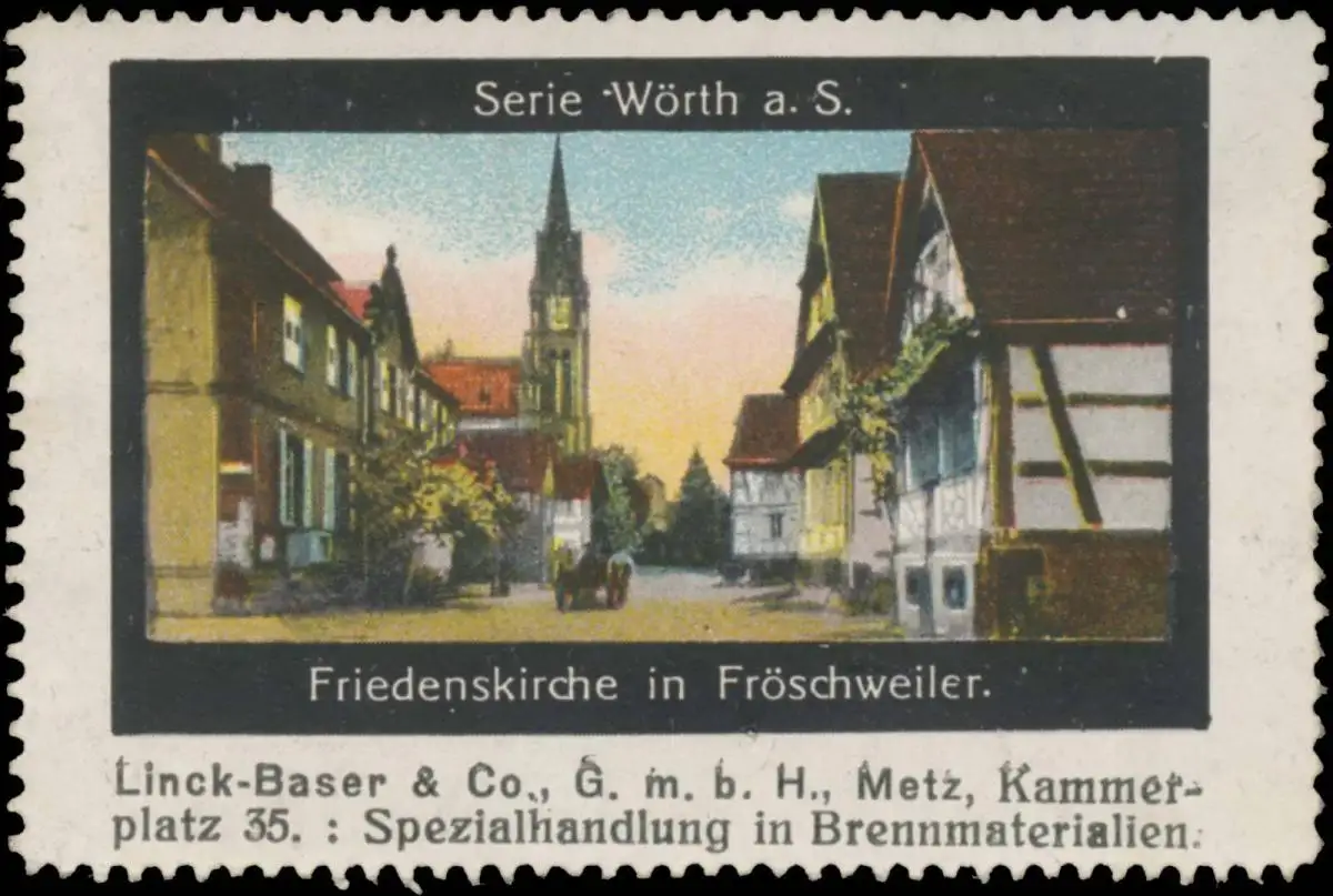 Serie Wörth, Linck-Baser & Co. GmbH, Metz, Kammerplatz 35, Spezialhandlung in Brennmaterialien, Größe/Zustand: 4x7 , beschädigt, Original alte Reklamemarke die seinerzeit für die Werbung benutzt wurde