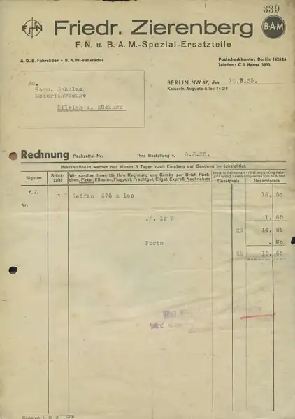 Friedr. Zierenberg FN / BAM Rechnung von 1935