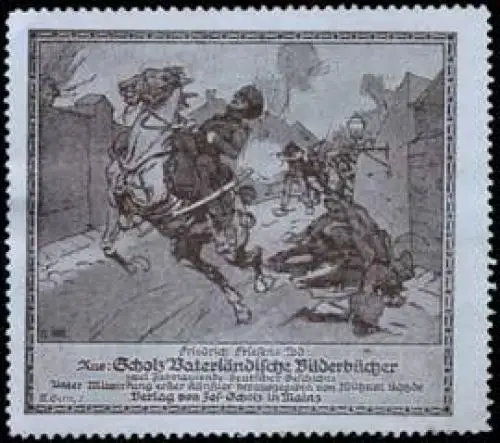 Friedrich Friesens Tod, Herausgeber: Wilhelm Kotzde, Reihe: Vaterländische Bilderbücher, Größe/Zustand: 6x7 , guter Zustand, Original alte Reklamemarke die seinerzeit für die Werbung benutzt wurde