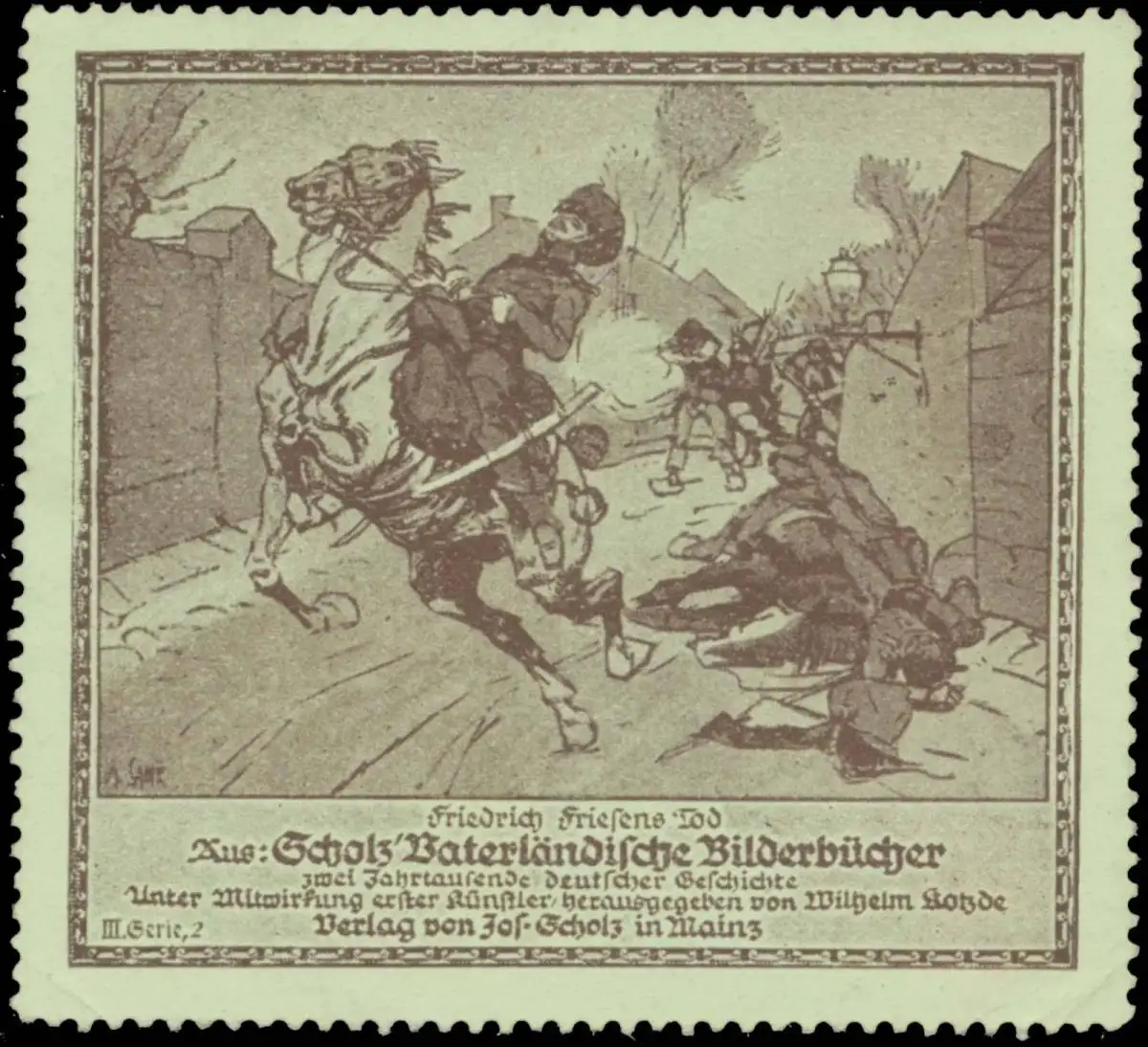 Herausgeber: Wilhelm Kotzde, Reihe: Vaterländische Bilderbücher, Befreiungskriege, Größe/Zustand: 6x6 , guter Zustand, Original alte Reklamemarke die seinerzeit für die Werbung benutzt wurde