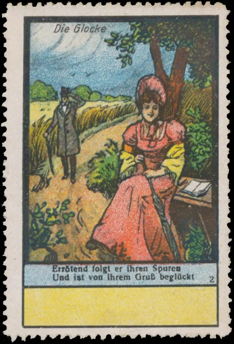 Errötend folgt er ihren Spuren und ist von ihrem Gruß beglückt. Bild 2, Größe/Zustand: 6x4 , guter Zustand, Original alte Reklamemarke die seinerzeit für die Werbung benutzt wurde
