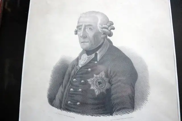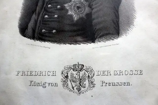 Friedrich der Große (1712 - 1786). - Brustbild nach halbrechts, in Uniform mit dem Stern des Schwarzen Adler-Ordens, unterm Porträt links: Druck von Bernh. Kehse & Sohn in Magdeburg, rechts: auf Subscription herausgegeben von Bernhard Hase, Lithografie gerahmt mit neuem Rahmen, sichtbares Bild: 34,5 x 28,0 cm, Rahmenbreite 2,8 cm