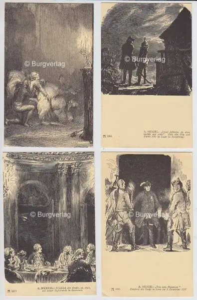 Bemerkungen: Die Serie bestand aus 12 Karten. Vorhanden: Friedrich des Großen Tod. -Der alte Fritz beim Spaziergang in Sanssouci.. -"Unser Alliierter da oben verläßt uns nicht!" (Der alte Fritz und Zieten 1761 im Lager zu Bunzelwitz). - Friedrich der Große in der Schlacht bei Torgau am 3. November 1760. - "Bon soir, Massieurs". Friedrich der Große in Lissa am 5. Dezember 1757. - Friedrich des Großen Ansprache an seine Generale vor der Schlacht bei Leuthen. - Friedrich der Große, ca. 1750, mit seiner Tafelrunde in Sanssouci.