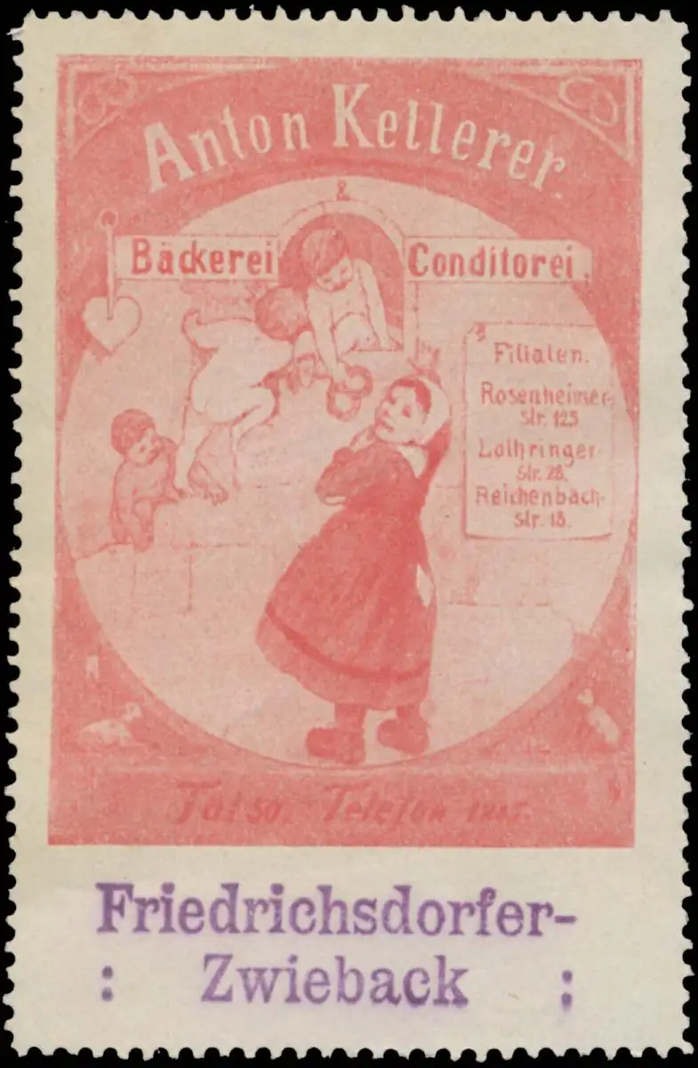 Bäckerei & Konditorei, Kinder, Tal 50, Rosenheimer Str. 125, Lothringerstr. 28, Reichenbach Straße 18, rot, Größe/Zustand: 7x5 , guter Zustand, Original alte Reklamemarke die seinerzeit für die Werbung benutzt wurde