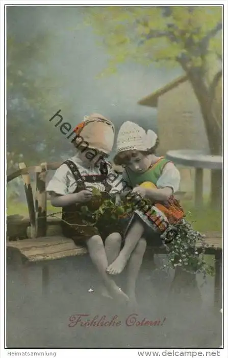 Fröhliche Ostern - Kinder auf einer Bank sitzend (E12602) gel. 1914
