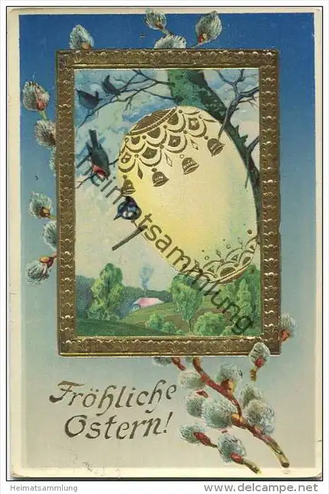 Fröhliche Ostern - Meisen - Osterei als Vogelnest - Prägedruck (E9436) gel. 1913