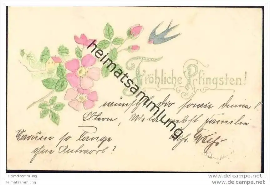 Fröhliche Pfingsten - Blumen - Schwalbe - Prägedruck - Eckknick oben rechts (G20228) gel. 1907