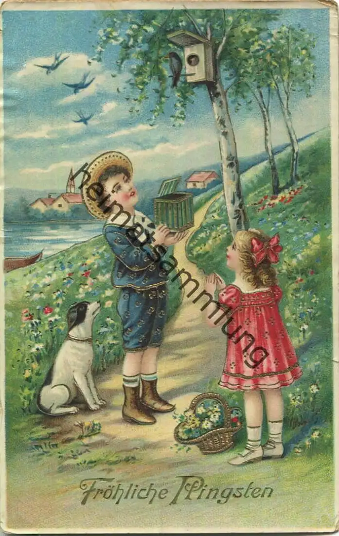 Fröhliche Pfingsten - Goldprägedruck - Marke entfernt - leichte Gebrauchsspuren (G10235) gel.