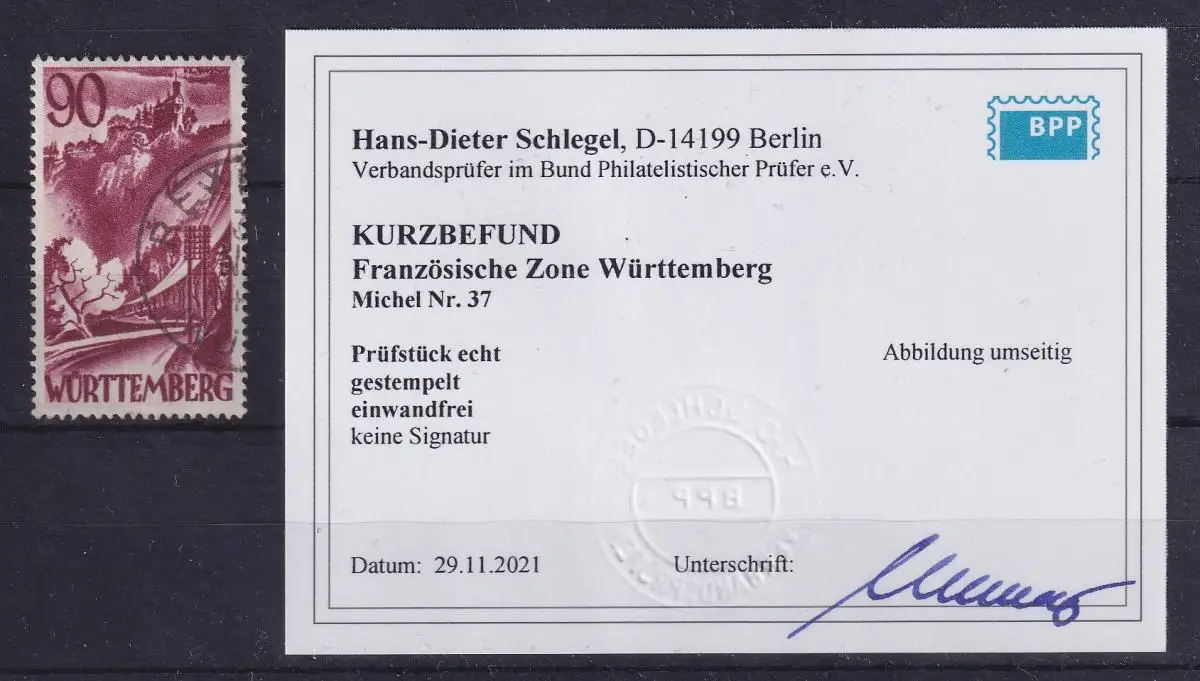 Frz. Zone Württemberg 1948 Mi.-Nr. 37 gestempelt, geprüft KB SCHLEGEL BPP